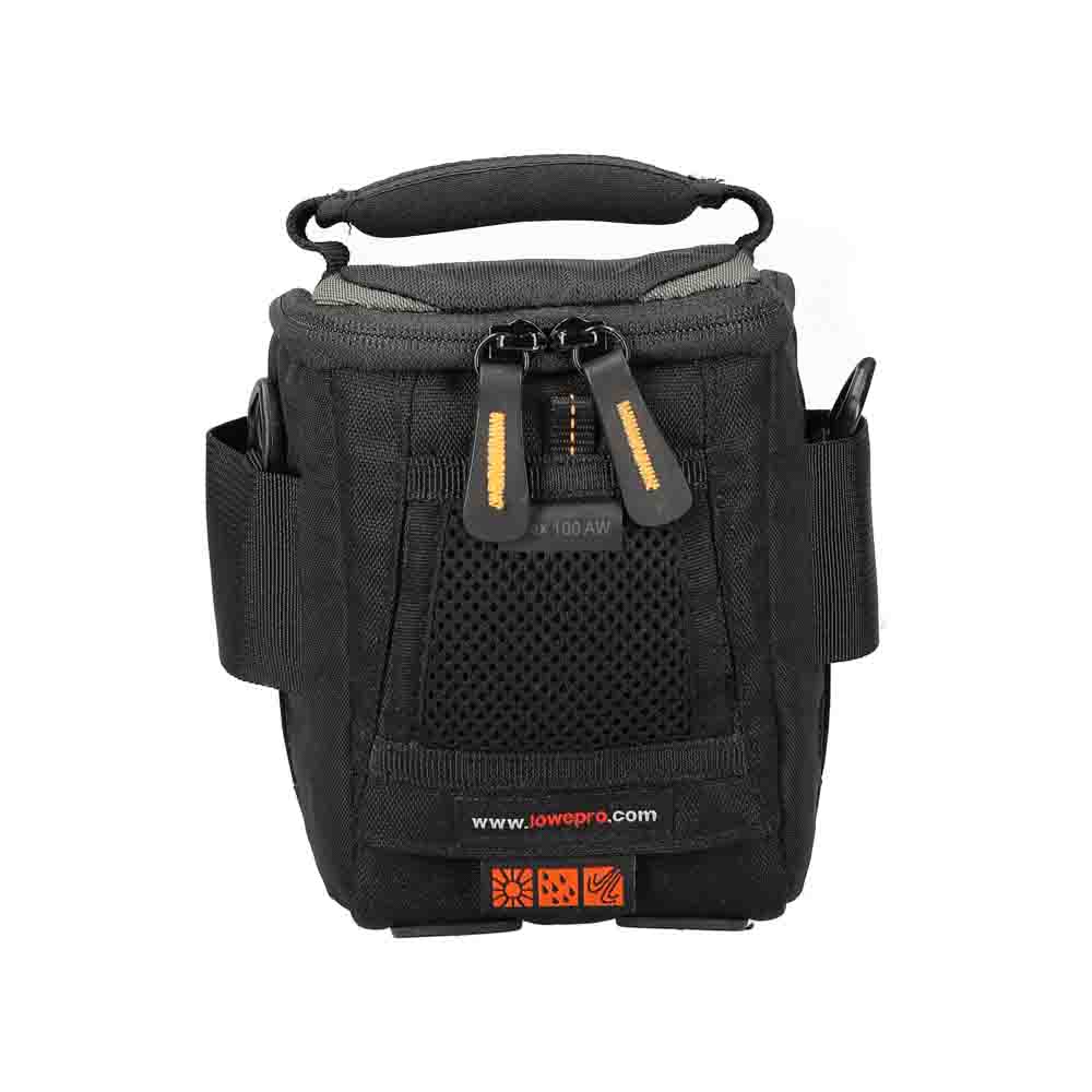 De tas heeft een geïntegreerde AW (All Weather) regenhoes voor onverwachte buien. Je camera staat op een stevige, beschermende bodem die tegen een stootje kan. In de klep zit een vakje voor kleine spullen zoals geheugenkaarten. Daarnaast is er ruimte voor accessoires zoals een extra accu en lader. Je draagt hem met de schouderriem of aan de handgreep, en je kunt hem ook aan een riem of groter systeem bevestigen.